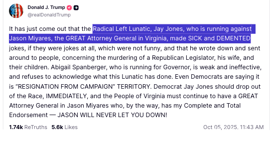 The president continued, “Abigail Spanberger, who is running for Governor, is weak and ineffective, and refuses to acknowledge what this Lunatic has done. Even Democrats are saying it is “RESIGNATION FROM CAMPAIGN” TERRITORY. Democrat Jay Jones should drop out of the Race, IMMEDIATELY, and the People of Virginia must continue to have a GREAT Attorney General in Jason Miyares who, by the way, has my Complete and Total Endorsement — JASON WILL NEVER LET YOU DOWN!”