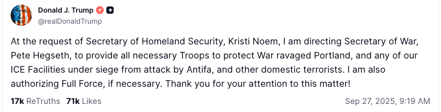 President Donald Trump last week directed DHS Secretary Kristi Noem and Secretary of War Pete Hegseth to mobilize troops to ICE facilities across the country, and in “‘war ravaged’ Portland…under siege from attack by Antifa, and other domestic terrorists.”