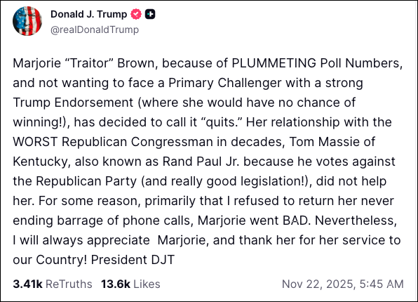 — Marjorie Taylor Greene đşđ¸ (@mtgreenee) November 22, 2025