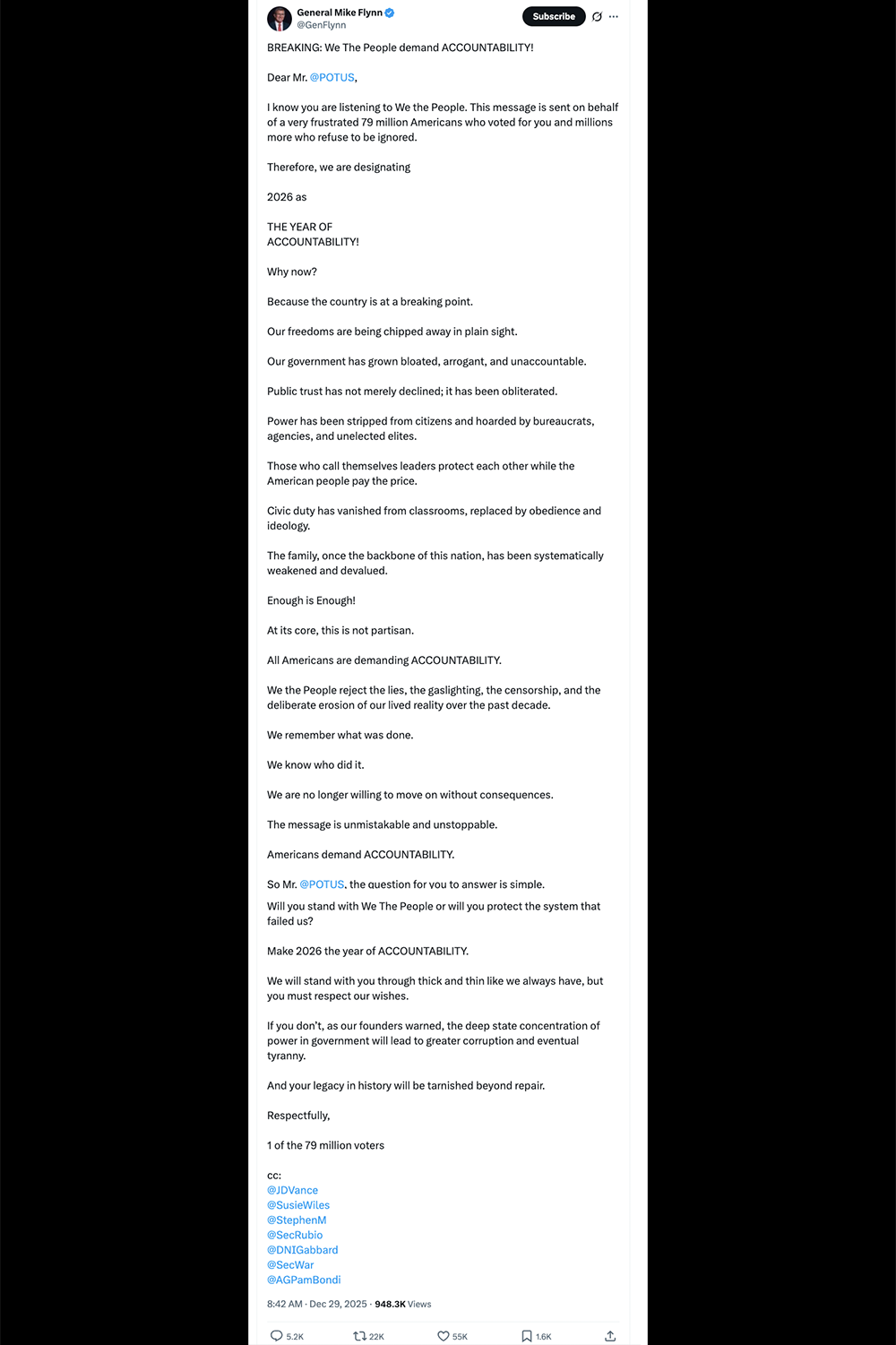 — General Mike Flynn (@GenFlynn) December 29, 2025