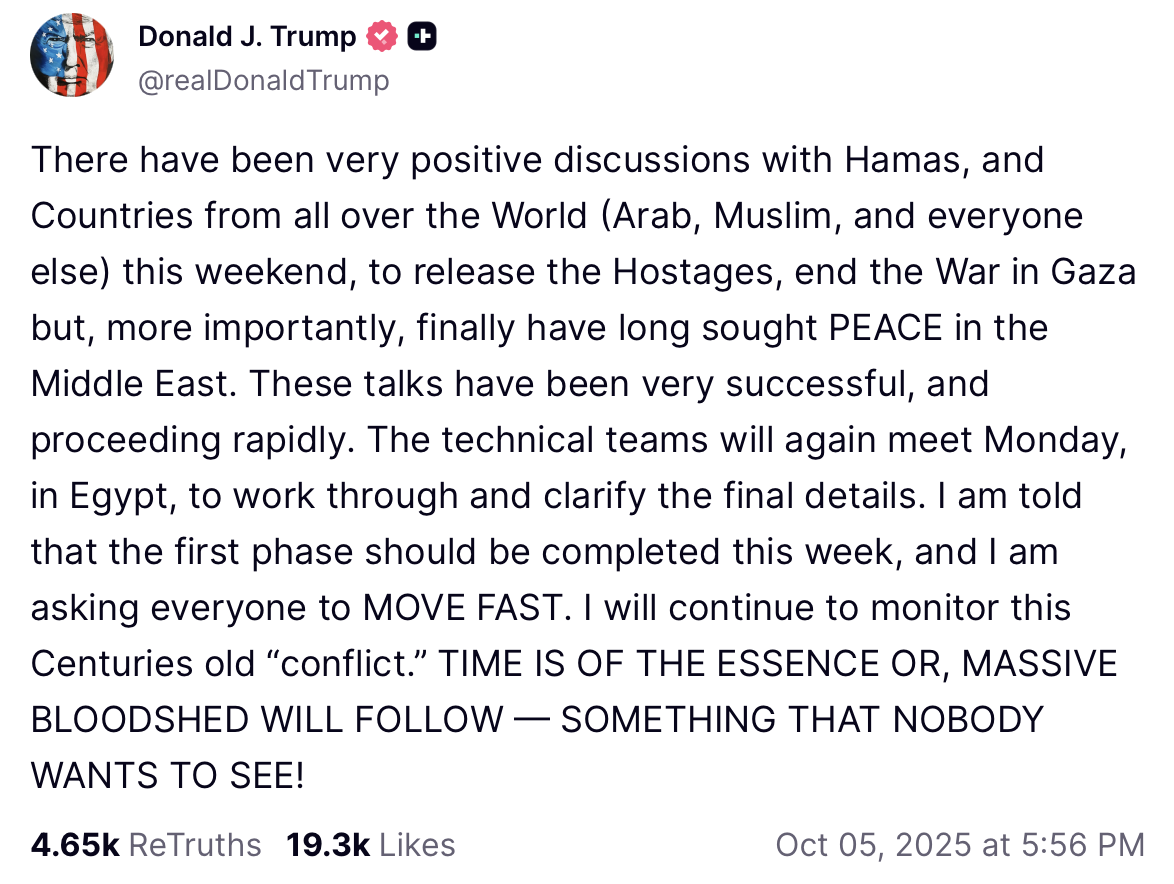 There have been very positive discussions with Hamas, and Countries from all over the World (Arab, Muslim, and everyone else) this weekend, to release the Hostages, end the War in Gaza but, more importantly, finally have long sought PEACE in the Middle East. These talks have been very successful, and proceeding rapidly. The technical teams will again meet Monday, in Egypt, to work through and clarify the final details. I am told that the first phase should be completed this week, and I am asking everyone to MOVE FAST. I will continue to monitor this Centuries old “conflict.” TIME IS OF THE ESSENCE OR, MASSIVE BLOODSHED WILL FOLLOW — SOMETHING THAT NOBODY WANTS TO SEE!