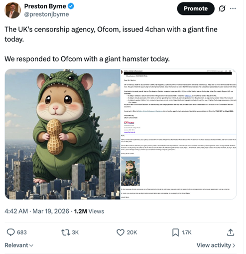 Nor is my client’s fight against Ofcom and across America’s borders the fight I care about the most – although I care about that fight a great deal. The reality of it all is that the refusals of Ofcom’s orders, the lawsuits in America, the GRANITE Act foreign censorship shield bills now advancing in legislatures across the United States, the cartoon hamster – all of these are early battles in a far wider war.