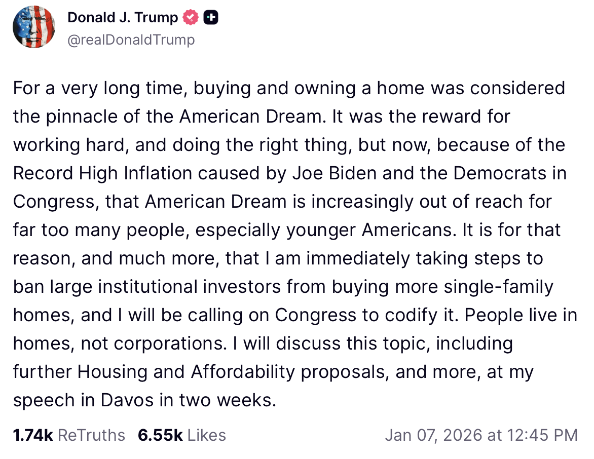 “To preserve the supply of single-family homes for American families and increase the paths to homeownership, it is the policy of my Administration that large institutional investors should not buy single-family homes that could otherwise be purchased by families,” the executive order said.
