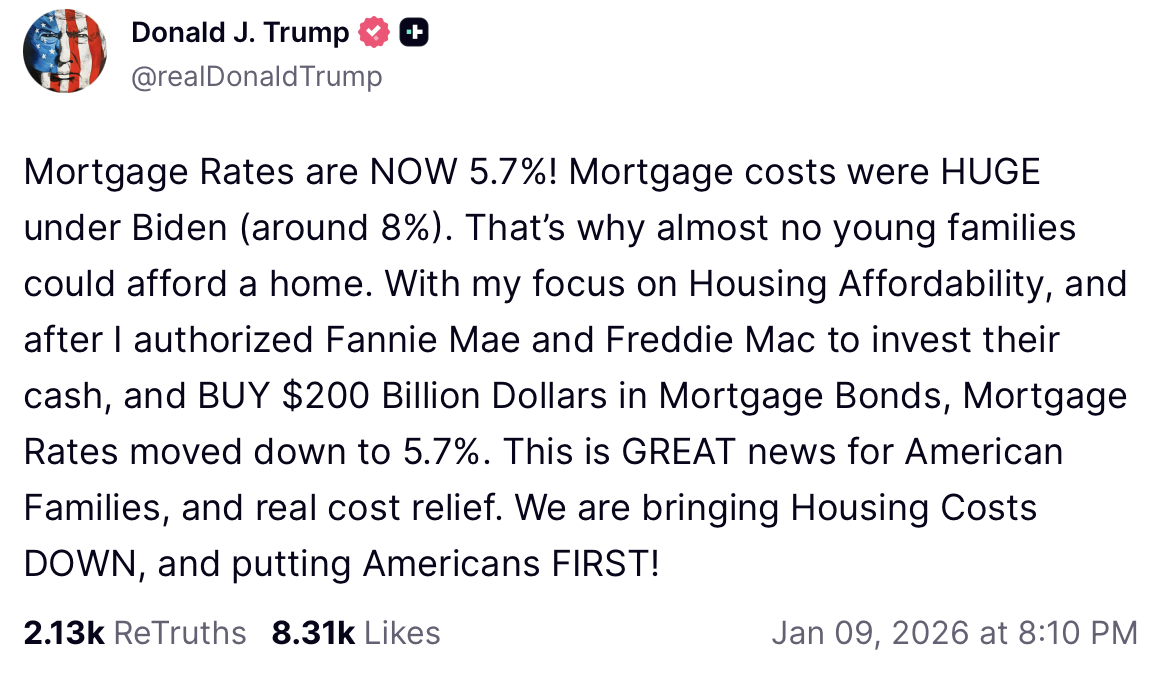 Infowars reported on January 9 that the President announced he was able to get mortgage rates down to 5.7% and that he will be capping credit card interest rates to 10% for one year.