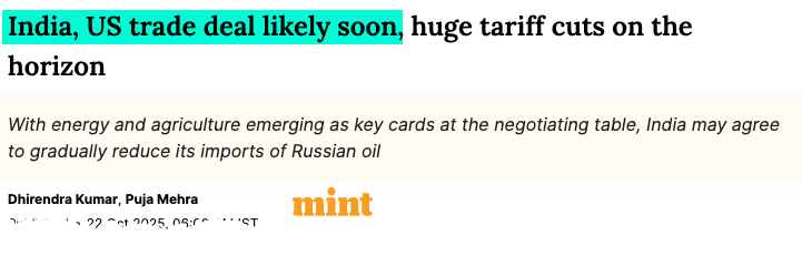 The U.S. and India are close to a possible trade deal that would reduce tariffs on Indian exports to about 15% to 16% from the current 50%, according to the Mint.
