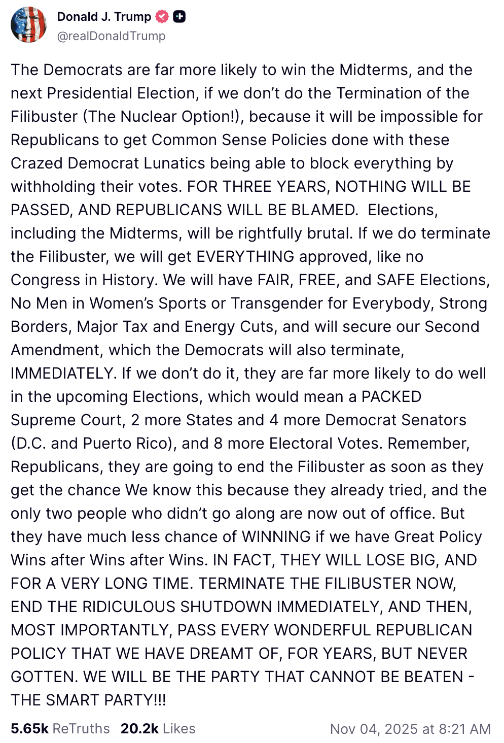 The Democrats are far more likely to win the Midterms, and the next Presidential Election, if we don’t do the Termination of the Filibuster (The Nuclear Option!), because it will be impossible for Republicans to get Common Sense Policies done with these Crazed Democrat Lunatics being able to block everything by withholding their votes. FOR THREE YEARS, NOTHING WILL BE PASSED, AND REPUBLICANS WILL BE BLAMED. Elections, including the Midterms, will be rightfully brutal. If we do terminate the Filibuster, we will get EVERYTHING approved, like no Congress in History. We will have FAIR, FREE, and SAFE Elections, No Men in Women’s Sports or Transgender for Everybody, Strong Borders, Major Tax and Energy Cuts, and will secure our Second Amendment, which the Democrats will also terminate, IMMEDIATELY. If we don’t do it, they are far more likely to do well in the upcoming Elections, which would mean a PACKED Supreme Court, 2 more States and 4 more Democrat Senators (D.C. and Puerto Rico), and 8 more Electoral Votes. Remember, Republicans, they are going to end the Filibuster as soon as they get the chance We know this because they already tried, and the only two people who didn’t go along are now out of office. But they have much less chance of WINNING if we have Great Policy Wins after Wins after Wins. IN FACT, THEY WILL LOSE BIG, AND FOR A VERY LONG TIME. TERMINATE THE FILIBUSTER NOW, END THE RIDICULOUS SHUTDOWN IMMEDIATELY, AND THEN, MOST IMPORTANTLY, PASS EVERY WONDERFUL REPUBLICAN POLICY THAT WE HAVE DREAMT OF, FOR YEARS, BUT NEVER GOTTEN. WE WILL BE THE PARTY THAT CANNOT BE BEATEN – THE SMART PARTY!!!