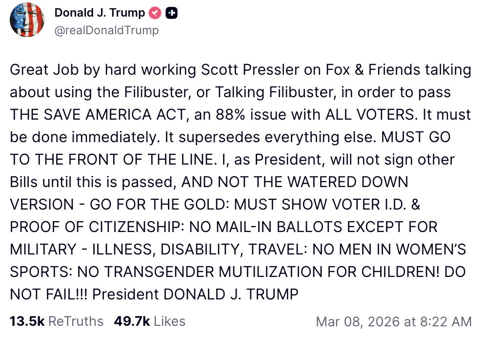 Great Job by hard working Scott Pressler on Fox & Friends talking about using the Filibuster, or Talking Filibuster, in order to pass THE SAVE AMERICA ACT, an 88% issue with ALL VOTERS. It must be done immediately. It supersedes everything else. MUST GO TO THE FRONT OF THE LINE. I, as President, will not sign other Bills until this is passed, AND NOT THE WATERED DOWN VERSION – GO FOR THE GOLD: MUST SHOW VOTER I.D. & PROOF OF CITIZENSHIP: NO MAIL-IN BALLOTS EXCEPT FOR MILITARY – ILLNESS, DISABILITY, TRAVEL: NO MEN IN WOMEN’S SPORTS: NO TRANSGENDER MUTILIZATION FOR CHILDREN! DO NOT FAIL!!! President DONALD J. TRUMP