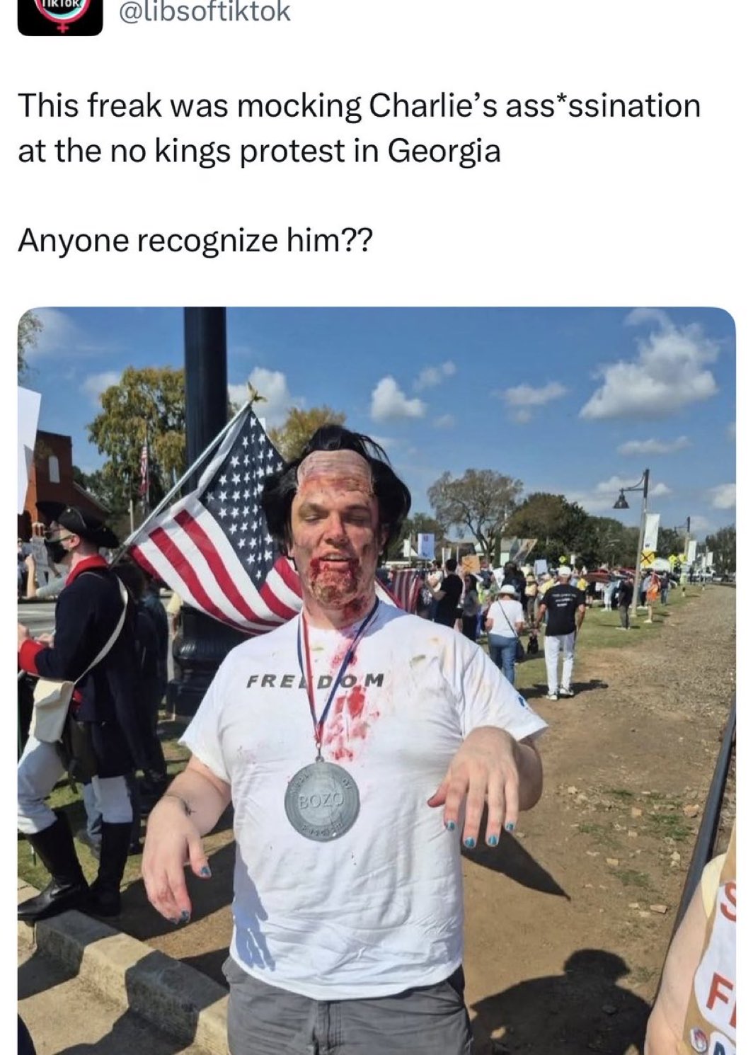 One demented liberal man dressed as a deceased Kirk during a Georgia “No Kings” demonstration earlier this month.