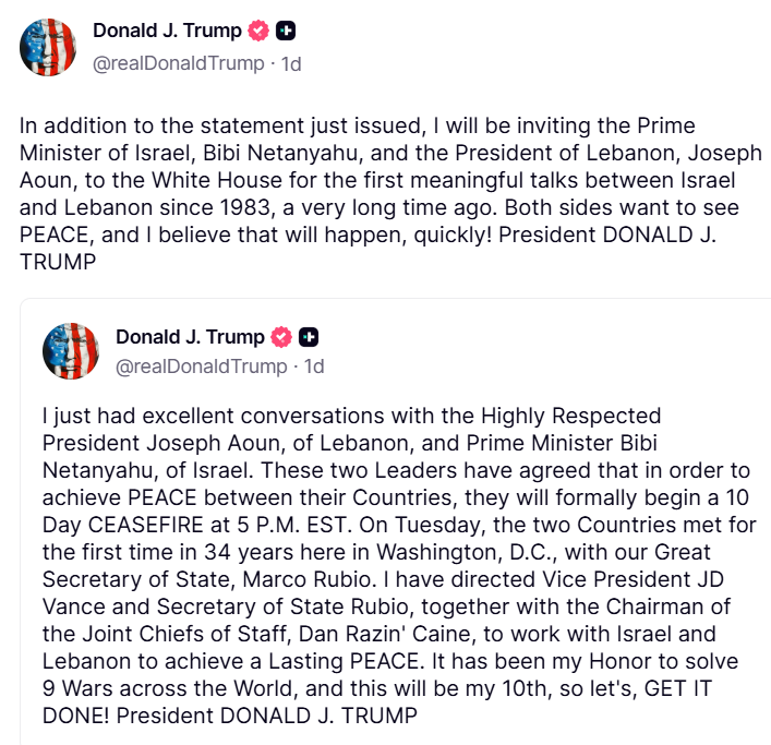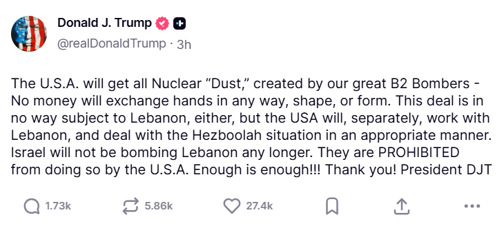 Reuters wrote, “The reports of the strike came minutes after U.S. President Donald Trump said the United States had banned Israel from further bombing in Lebanon.”
