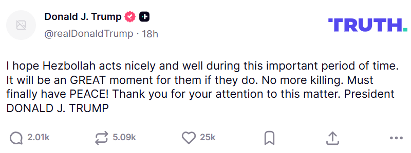 President Trump on Thursday expressed “hope” that Hezbollah “acts nicely and well” during the ceasefire, but he was apparently worried about the wrong party!