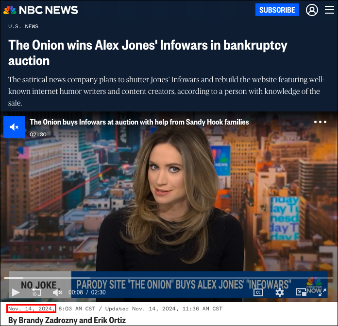 The Onion once again appears to be pulling the same maneuver as before, by having the media preemptively report untruths and falsehoods that they’ve acquired Infowars, before a judge has officially signed off on any such acquisition.