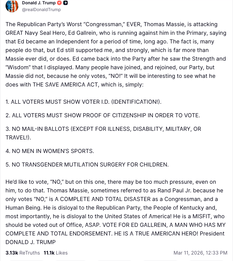 “I have heard that there are other Candidates exploring a run for this seat, but I am asking all MAGA Warriors to rally behind Captain Ed Gallrein, the Candidate who is, far and away, best positioned to DEFEAT Third Rate Congressman Thomas Massie, a Weak and Pathetic RINO from the beautiful Commonwealth of Kentucky, a place I love, and won BIG, ALL THREE TIMES,” Trump wrote.