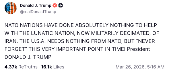 “NATO NATIONS HAVE DONE ABSOLUTELY NOTHING TO HELP WITH THE LUNATIC NATION, NOW MILITARILY DECIMATED, OF IRAN. THE U.S.A. NEEDS NOTHING FROM NATO, BUT ‘NEVER FORGET’ THIS VERY IMPORTANT POINT IN TIME!” the president posted to Truth Social in all caps.