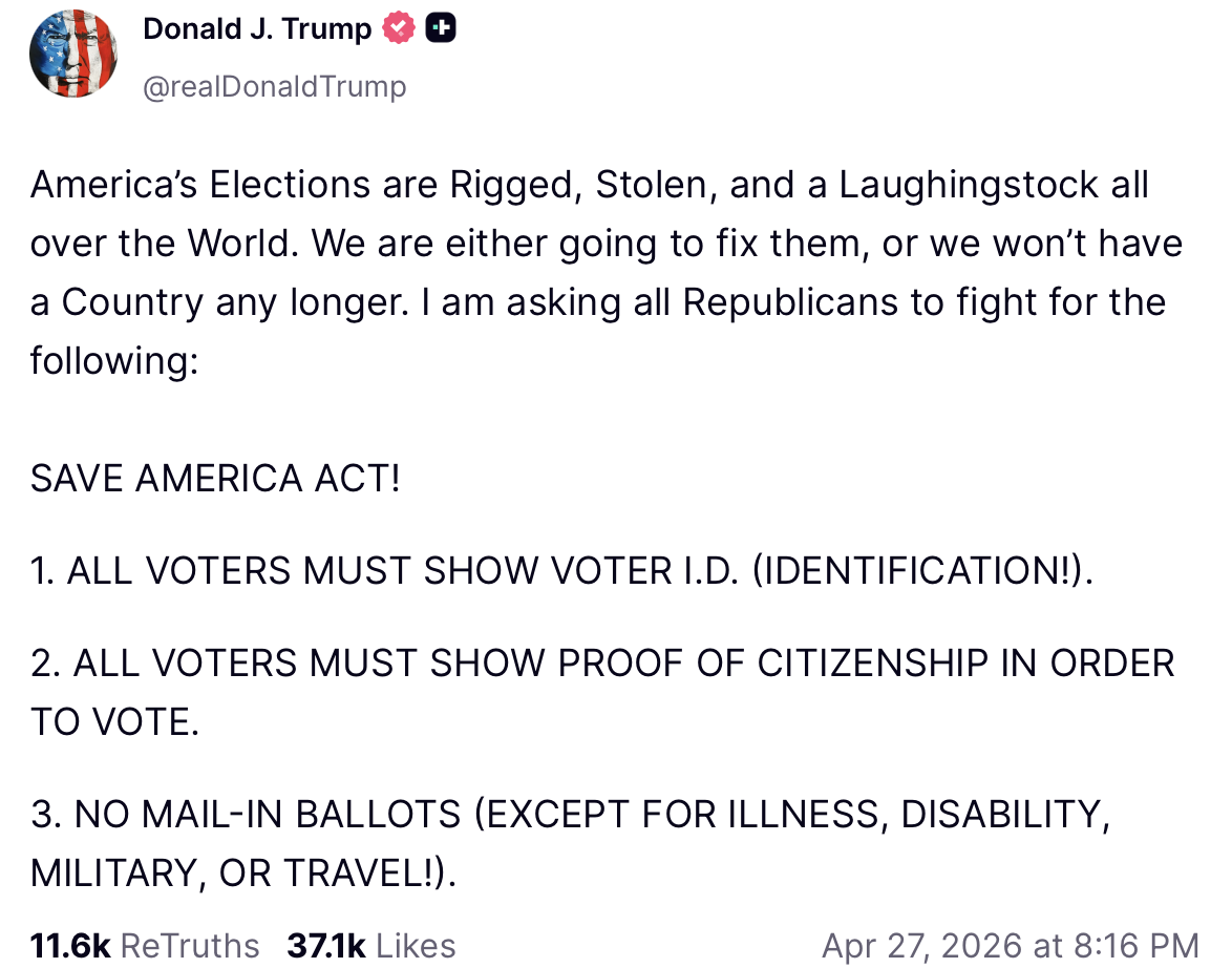 Image Credit: Tasos Katopodis / Stringer / Getty President Donald Trump continued to push Republicans to pass the SAVE America Act (H.R. 7296/S. 3752) in order to protect elections from fraud, as was witnessed in 2020. While the legislation passed the House in February, it is expected to die in the Senate at the hands of RINO Republicans.