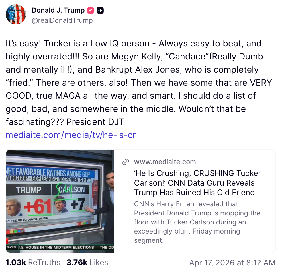 Tucker’s remarks appearing to disavow Trump come as POTUS has been lashing out at him and other pro-Trump, but Iran war-critical conservative figures, including Infowars’ Alex Jones, Candace Owens and Megyn Kelly, labeling them “low IQ” and “nut jobs.”
