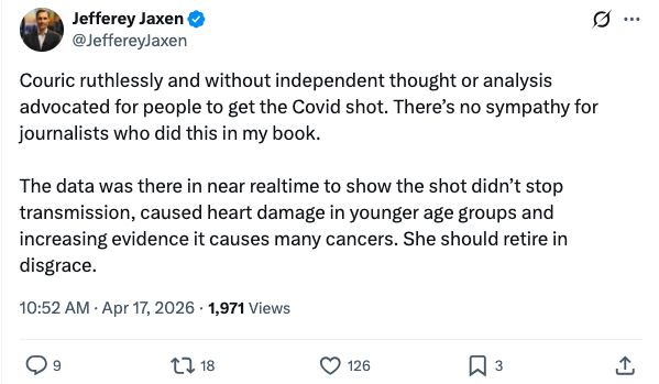 Journalist and activist Jefferey Jaxen highlighted how Couric previously used her influential position to shill for the Covid jab, saying, “Couric ruthlessly and without independent thought or analysis advocated for people to get the Covid shot. There’s no sympathy for journalists who did this in my book.”