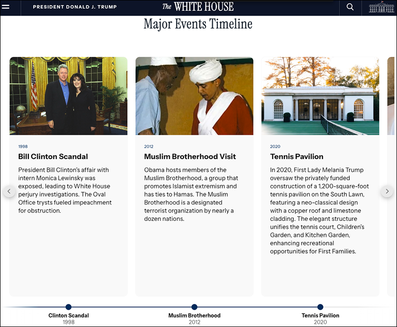 The White House’s “Major Events Timeline,” cataloguing historical events impacting the Executive Office building, on Thursday was amended to include Clinton’s infamous intern scandal, Obama’s meeting with radical Muslims, and various Joe Biden wrongdoings.